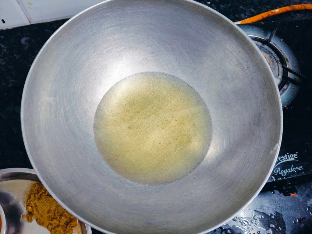 मसाला पिसने के बाद हमे सबसे पहले गैस पर एक कढाई रखनी है