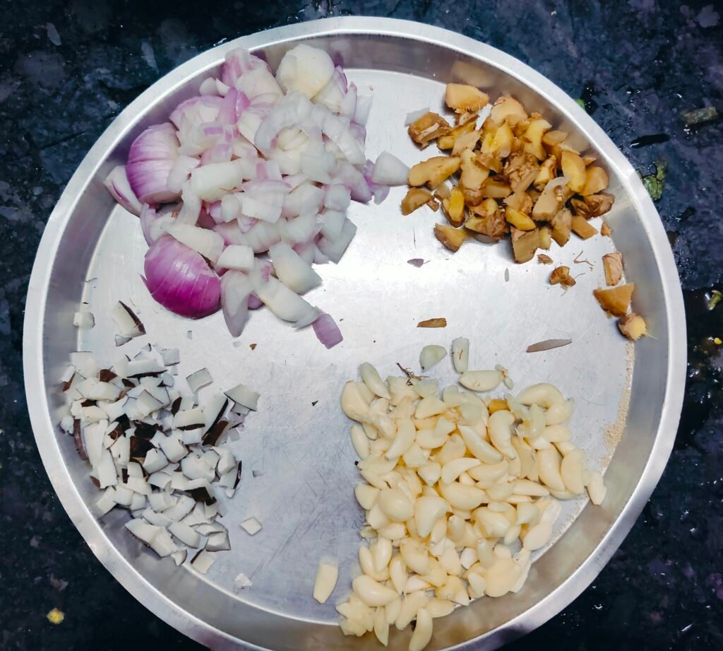 सबसे पहले हम लसूण और अद्रक को अच्छे से साफ करके लेंगे फिर प्याज को  कट करके लेंगे नारियल की भी छोटे छोटे तुकडे कर लेंगे