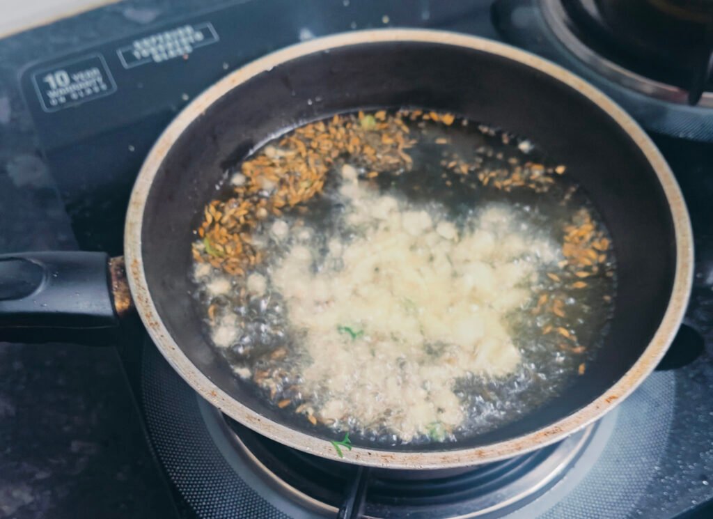 फिर उसके बाद हम दाल तडका लगाने के लिए तडका की तयारी करते है गॅस पर एक छोटीसी प्यान नही तों कढई रख देंगे उसमे तेल डाल देंगे और फिर बारीक काटा लहसून राई जिरा डाल देंगे हो गरम होने के बाद उसमे तीन से चार लाल सुखी मिरची डाल देंगे