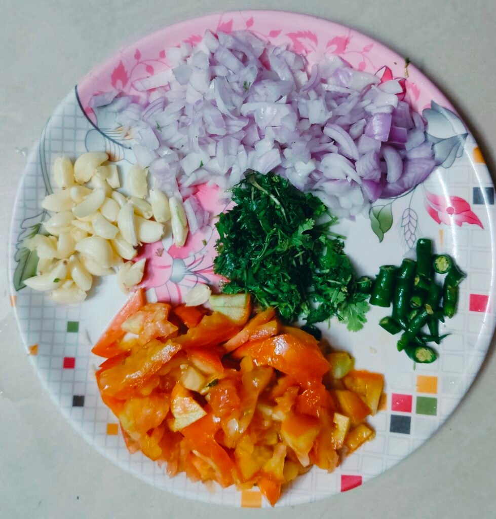 कुकर मे दाल पक रही है तब तक हम दाल तडका की तयारी करते है| हमने जो प्याज और टमाटर लिये थे उसे बारीक कट कर कर लेंगे लहसून और अद्रक की पेस्ट बनाकर लेंगे हरी धनिया को धोकर बारीक कट कर लेंगे हरी मिरची भी कट कर के लेंगे