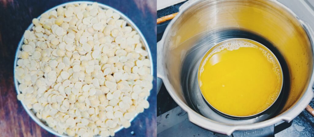 तो सबसे पहले हम एक कटोरी दाल लेंगे उसे दो से तीन पानी से अच्छे से धोकर लेंगे फिर उसे पकाने के लिए कुकर मे एक बर्तन मे दाल को डालेंगे और उस पर एक चमच हल्दी डाल कर मिक्स करके पकाने के लिए रख देंगे कुकर को दो से तीन सिटी होने तक रखेंगे