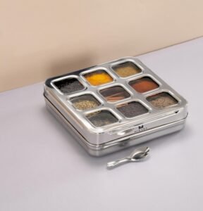 Mikara Stainless Steel Square Masala Dabba (9 Containers)/ Stainless steel Masala Dabba/Masala Box/Spice Dabba. Durable Construction: This masala