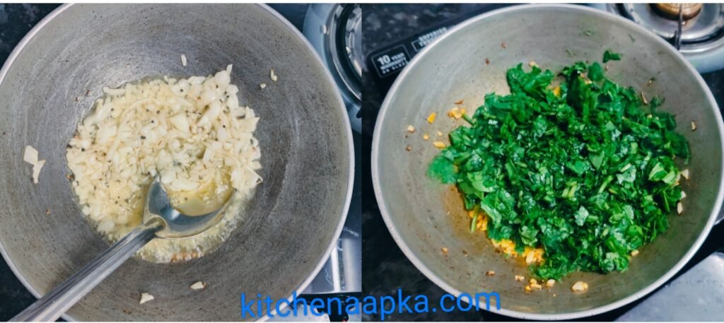 उसके बाद हम गॅस पर कढाई रखेंगे और उसमे 3 चमच तेल डालेंगे तेल गरम होने के बाद उसमे हम राई और जीरा डालेंगे उसके बाद हम हम प्याज और लसूण अद्रक की पेस्ट डालेंगे प्याज को अच्छे से लाल होने तक भुनेगे प्याज होने के बाद उसमे हम हल्दी पावडर, मिर्च पावडर,धनिया पावडर डालेंगे हे ये सब होने के बाद हम उसमे बारीक काटा हुआ पालक डाल देंगे