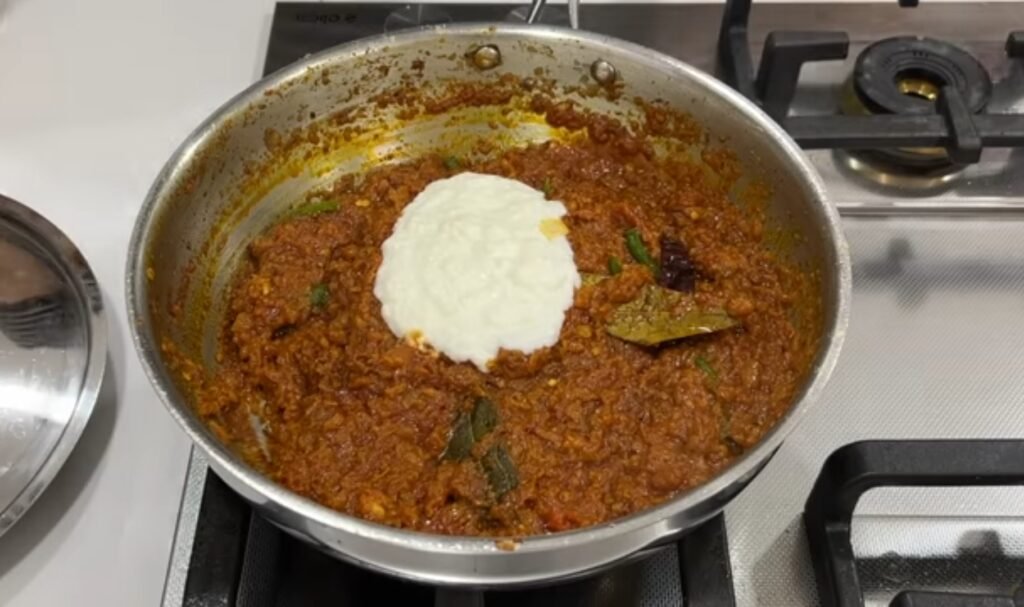 तब तक हम 1कटोरी मे दही लेंगे उसे थोडी देर तक फेट कर लेंगे दही ज्यादा खट्टा नही लेना चाहिये दही फेटकर कढई का ठक्कन निकाल कर उसमे दही डालना