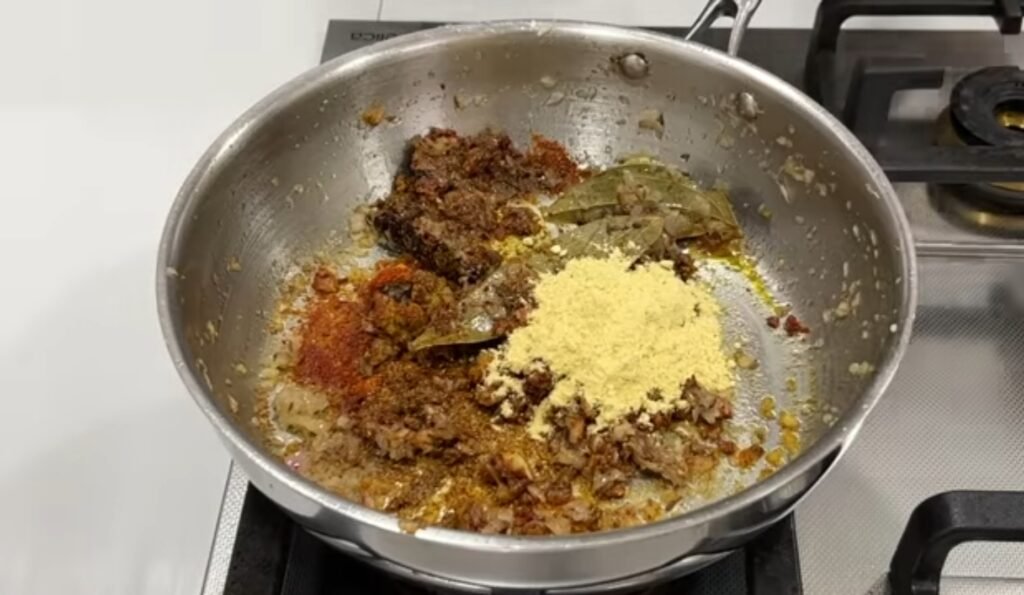 उसी के साथ हम लहसून और अद्रक की पेस्ट डालेंगे वह सब मिक्स करेंगे फिर 1/2चम्मच हलदी पावडर, 1चम्मच लाल मिर्च पावडर, 1 चम्मच धनिया पावडर,1/2चम्मच जिरे पावडर, गरम मसाला डालेंगे. गरम मसाला आपके पास जो भी है वो डाल सकते है फिर हम उसमे बेसन डालेंगे उसे अच्छी तरह से भुंनेगे