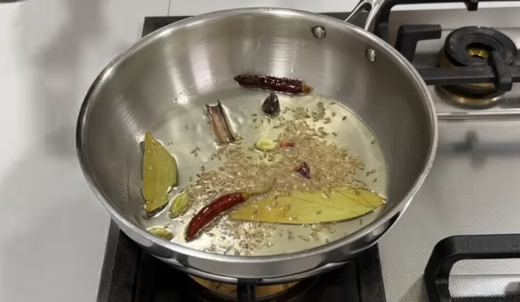 अब हम गॅस पे कढई रखेंगे उसमे 2 बडे चम्मच तेल डालेंगे फिर उसमे हमने जो खडे मसाले लिये थे वह डालेंगे