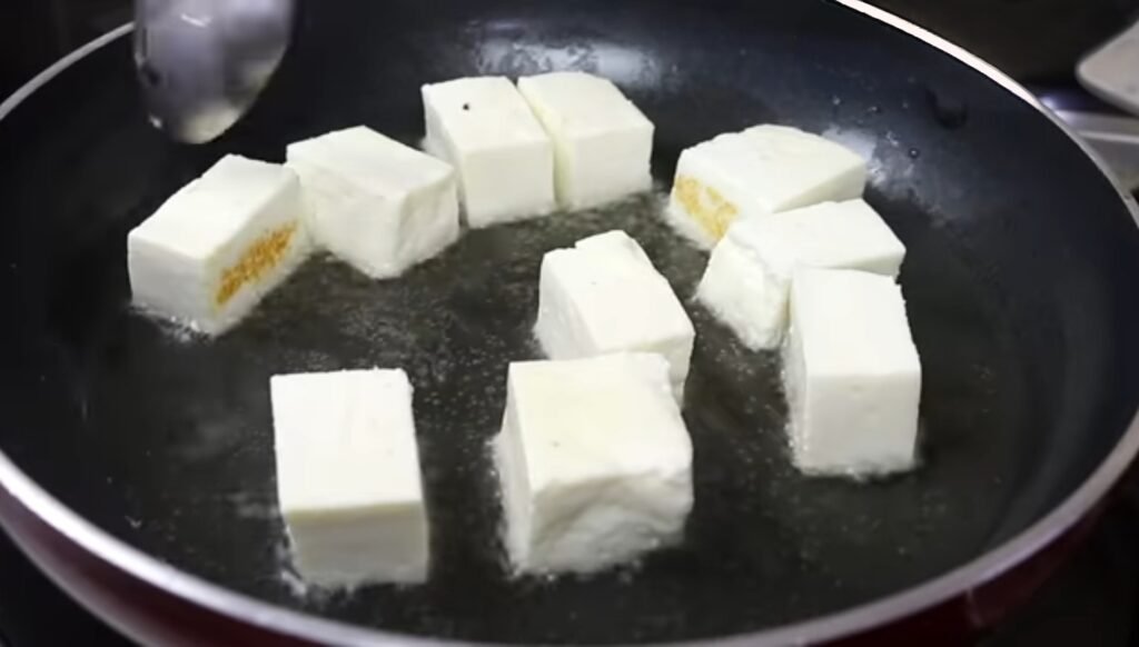 प्यान मे हम तेल डालेंगे थोडासा गरम होने की बात उसमे हमने जो पनीर कट कर के लिये था वह डालेंगे पनीर को हम थोडासा शालोफ्राय करके लेंगे फिर उसे निकाल के पानी में डालेंगे पानी मे थोडासा नमक डालेंगे इसे पनीर का एक स्वाद बड जाता है