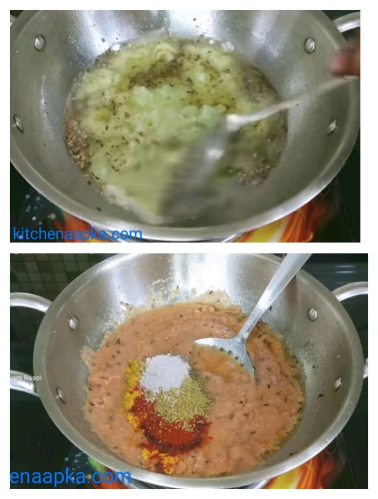 फिर हम गॅस पर कढाई रखेंगे उसमे बडे तीन,चार चमच तेल डालेंगे तेल गरम होने के बाद हम उसमे हमने जो मसाला पीस कर रखा था वो डाल देंगे मसाले को हमे अच्छे से लाल होने तक भुंनाना है मसाला अच्छे से भुंने के बाद उसमे तेल छुटता है फिर हम उसमे हलदी पावडर लाल मिरची पावडर धनिया पावडर चोली मसाला डाल देंगे फिर थोडासा पानी डाल देंगे