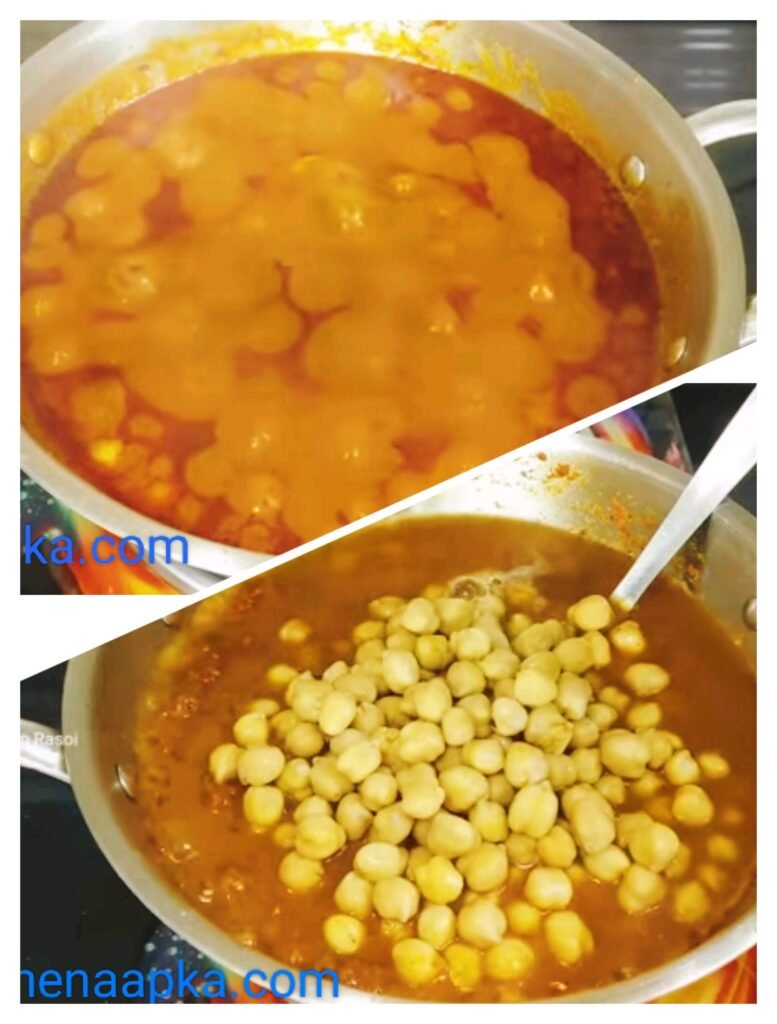 उसके बाद हम कढाई मे छोले डालेंगे और पानी भी फिर स्वाद के नुसार नमक डाल देंगे और जो हमने एक कटोरी में छोले निकालकर रखे थे वो छोले को थोडासा दबाकर डाल देंगे फिर सब मिक्स करके हम इसको अच्छे से उबाल कर लेना है फिर उसमे हरी धनिया बारीक कट कर डालेंगे और अच्छे से उबाल कर लेंगे फिर उसमे हम 2 छोटे चम्मच छोले मसाला डाल देंगे