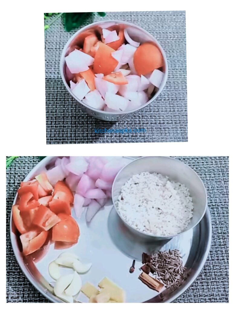 सबसे पहले हम लसूण और अद्रक लेंगे उसे साफ करके उसकी पेस्ट बनायेंगे फिर बाद मे प्याज को थोडा बडा कट कर के लेंगे नारियल के तुकडे भी कट करके लेंगे और टमाटर को भी कट कर के लेंगे